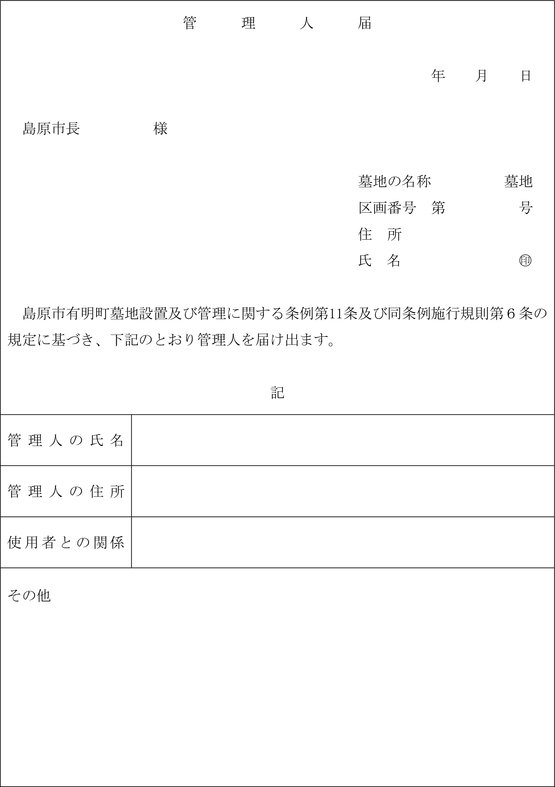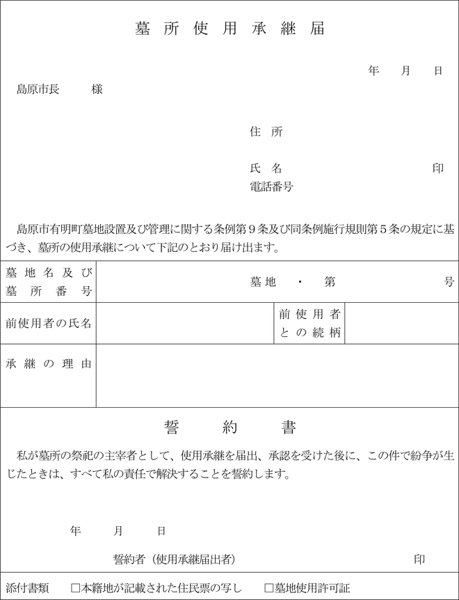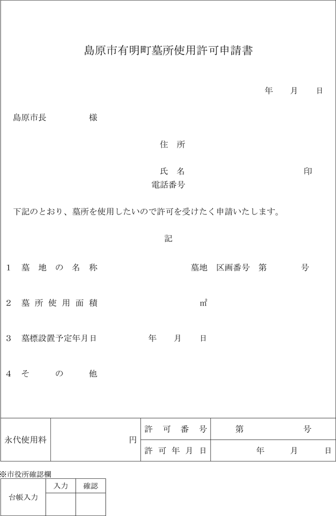 第2条 条例第5条の規定により、墓所の使用許可を受けようとする者は、島原市有明町墓所使用許可申請書(