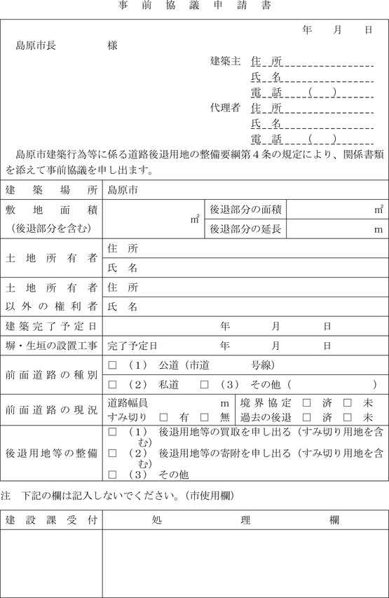 第4条 建築主等は、前条の土地に建築行為等を行おうとする場合は、事前(建築確認申請を要する建築行為等にあっては建築確認申請をする前)に、道路後退用地の整備、管理及び帰属等について、事前協議申請書を市長に提出し、協議するものとする。