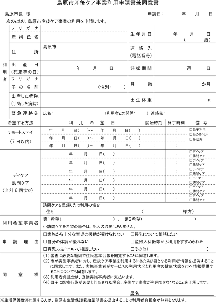 第6条 事業の利用を希望する者(以下「申請者」という。)は、島原市産後ケア事業利用申請書兼同意書(