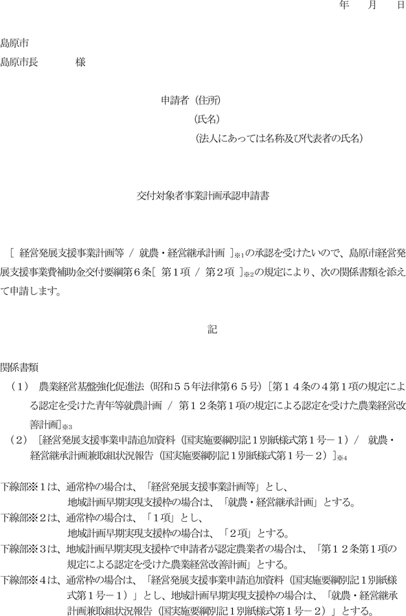 別紙様式第1号-2)(以下「就農・経営継承計画」という。)を添えて、市に申請しなければならない。