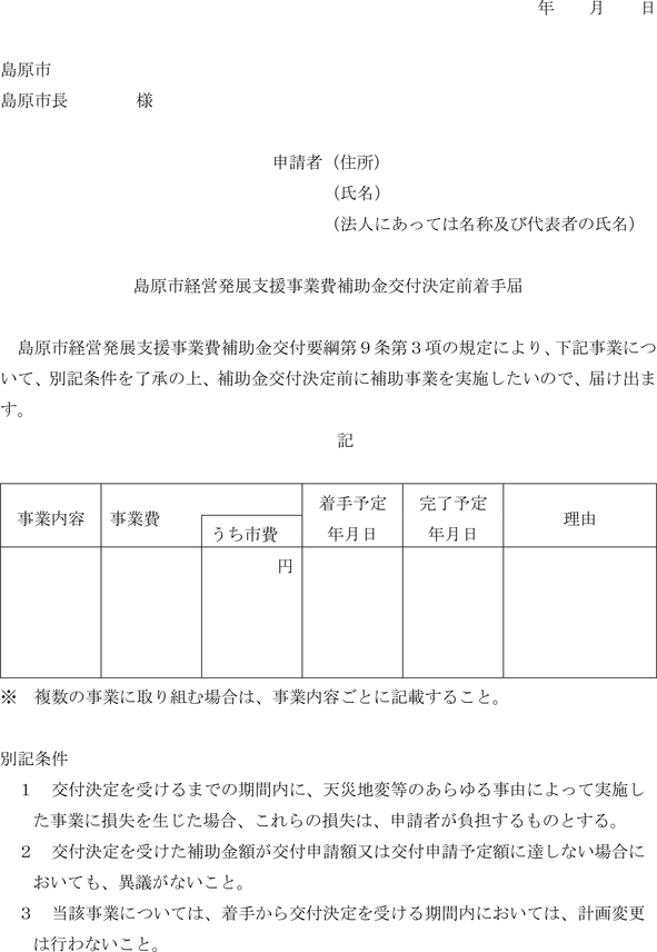 3 事業の着手は、原則として補助金交付決定後に行うものとする。ただし、やむを得ない事由により補助金交付決定前に着手する必要がある場合は、島原市経営発展支援事業費補助金交付決定前着手届(