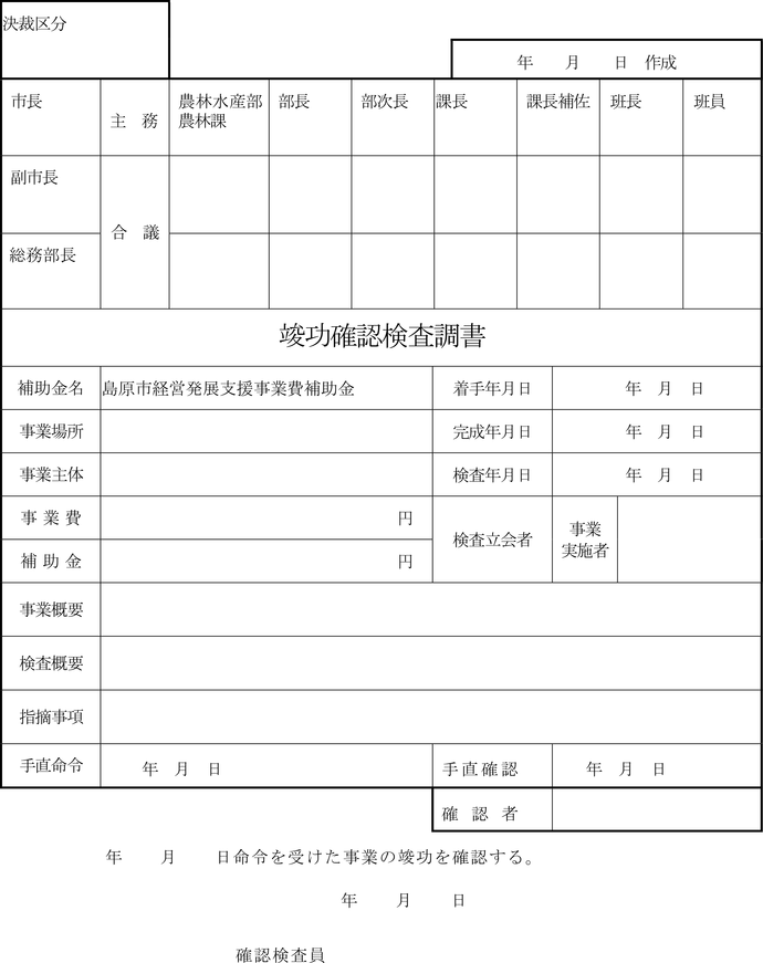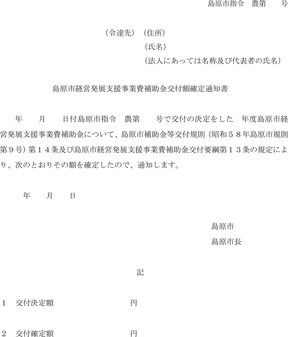 第13条 市は、前条の実績報告書が提出された場合は、その内容を審査し、補助金の交付決定の内容及びこれに付した条件に適合すると認めたときは、補助金の額を確定し、島原市経営発展支援事業費補助金交付額確定通知書(