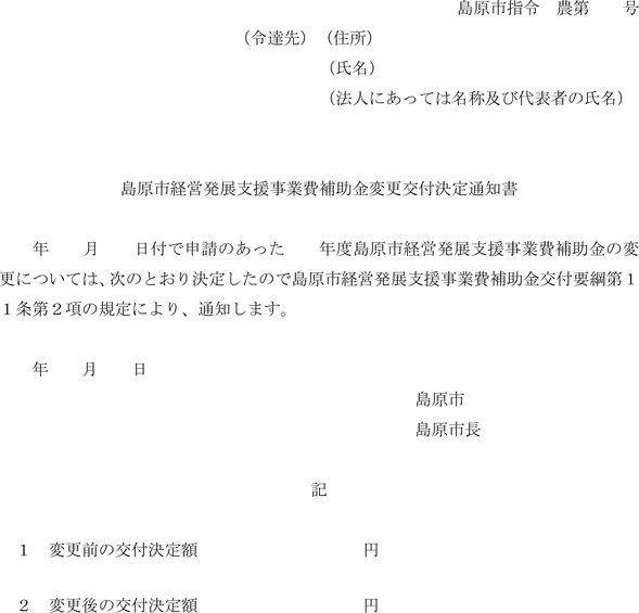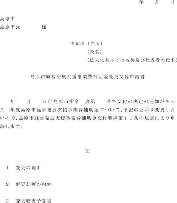 第11条 規則第11条第2項の規定により、第8条の規定により補助金の交付の決定の通知を受けた交付申請者(以下「交付決定者」という。)が、次の各号のいずれかに該当する場合には、島原市経営発展支援事業費補助金変更交付申請書(