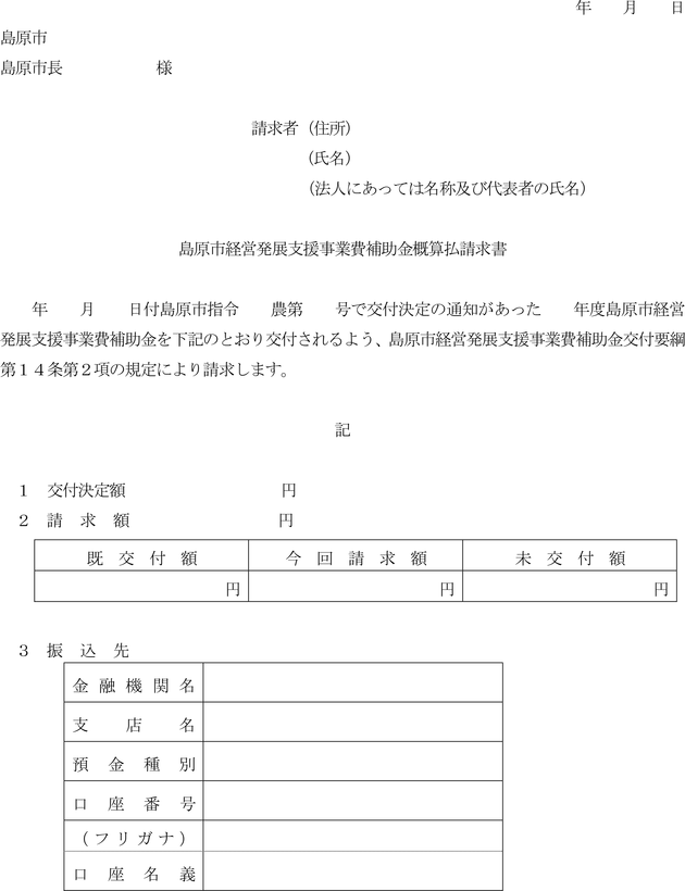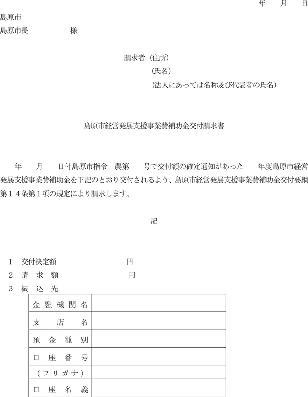 第14条 前条の額の確定通知を受けた交付決定者は、補助金の交付を受けようとする場合は、島原市経営発展支援事業費補助金交付請求書(
