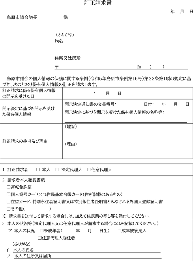 2 開示請求書等を議長に送付して開示請求、訂正請求又は利用停止請求(以下この項及び次項において「開示請求等」という。)をする場合には、開示請求者等は、前項の規定にかかわらず、次に掲げる書類を議長に提出すれば足りる。
