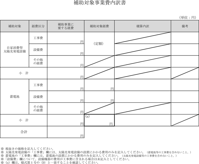 添付書類 | 1 見積書(補助対象事業費の内訳が確認できるもの) 2 蓄電池の仕様が分かる資料(様式自由) 3 その他市長が必要と認める書類 |