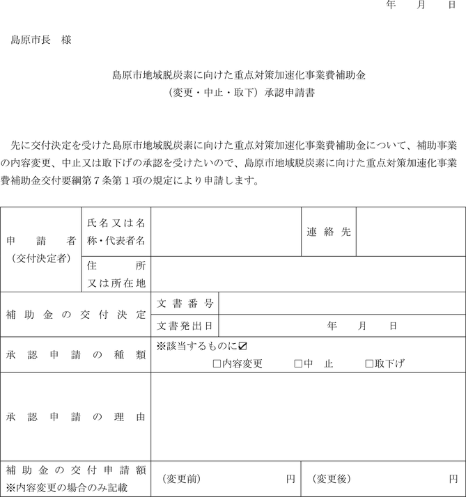 第7条 補助金の交付決定を受けた者(以下「補助事業者」という。)は、補助対象事業の変更等をしようとする場合は、島原市地域脱炭素に向けた重点対策加速化事業費補助金(変更・中止・取下)承認申請書(