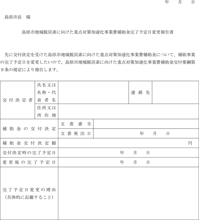 第9条 補助事業者は、補助事業が予定の期間内に完了しないため、当該事業の完了予定期日を変更しようとするときは、市長に島原市地域脱炭素に向けた重点対策加速化事業費補助金完了予定日変更報告書(