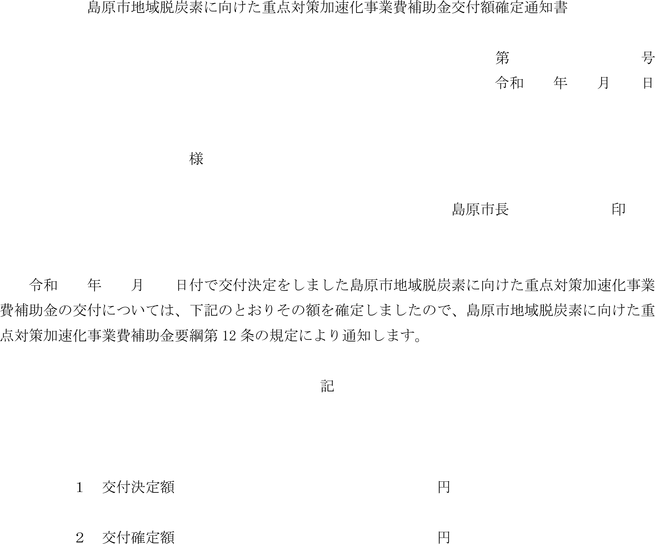 第12条 市長は前条の規定による実績報告を受けたときは、当該報告に係る書類の審査及び必要に応じて現地調査等を行い、報告内容がこの要綱の規定に適合していると認めたときは、交付すべき補助金の額を確定し、島原市地域脱炭素に向けた重点対策加速化事業費補助金交付額確定通知書(