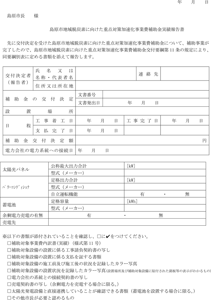 添付書類 | 1 補助対象事業費内訳書(実績)(様式第11号) 2 補助対象設備の設置に係る工事請負契約書の写し 3 補助対象設備の設置に係る支払を証する書類 4 補助対象設備の施工前・施工後の状況を記録したカラー写真 5 補助対象設備の設置状況を記録したカラー写真(設置場所又は補助対象設備に貼付された銘板等の表示が分かるもの) 6 電力会社の系統との接続契約書の写し 7 売電契約書の写し(余剰電力を売電する場合) 8 太陽光発電設備と直接連携していることが確認できる書類(蓄電池を設置する場合) 9 その他市長が必要と認めるもの |