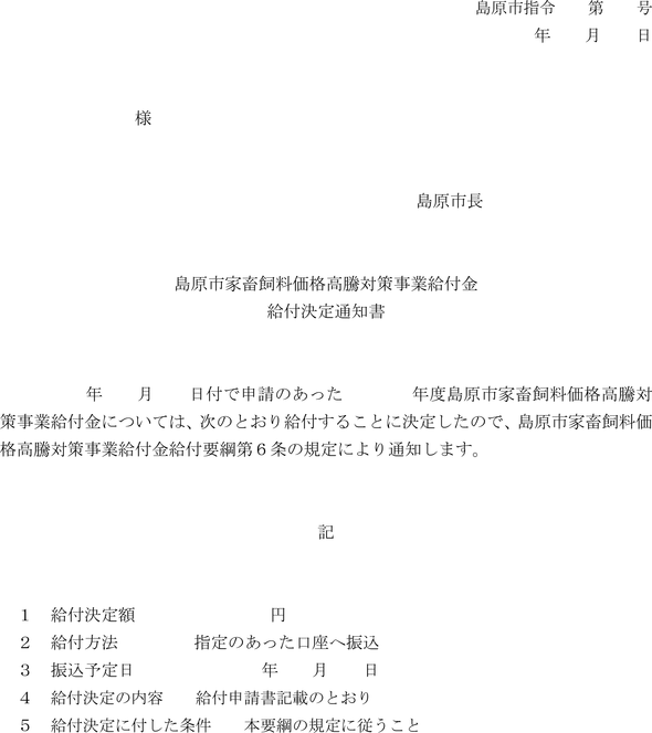 第6条 市長は、前条の規定による申請書を受理したときは、速やかに内容を審査し、適当と認めたときは、給付金の給付の決定を行い、島原市家畜飼料価格高騰対策事業給付金給付決定通知書(