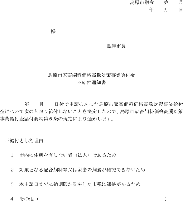 2 市長は、前項の規定により審査した結果、給付金を給付しないことを決定したときは、理由を付して、島原市家畜飼料価格高騰対策事業給付金不給付通知書(