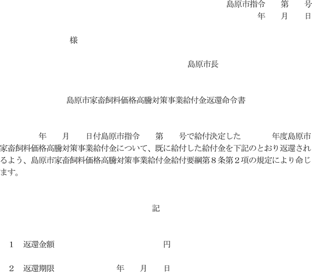 2 市長は、前項の規定により給付金の返還を命ずるときは、島原市家畜飼料価格高騰対策事業給付金返還命令書(