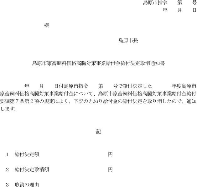 2 市長は、前項の規定により給付金の給付の決定を取り消すときは、島原市優良肉用子牛生産推進緊急対策事業給付金給付決定取消通知書(