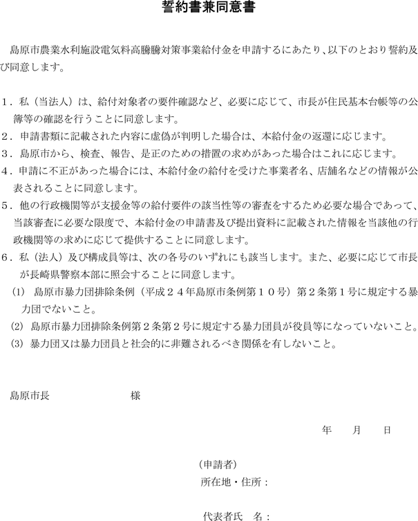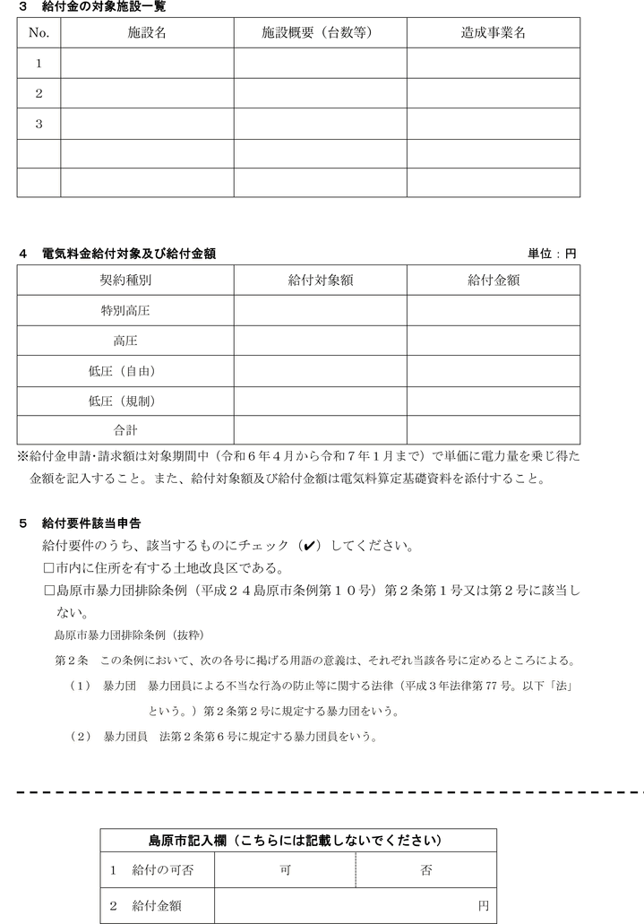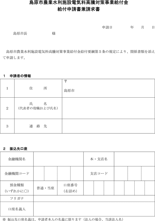 第5条 給付金の給付を受けようとする者(以下「申請者」という。)は、島原市農業水利施設電気料高騰対策事業給付金給付申請書兼請求書(