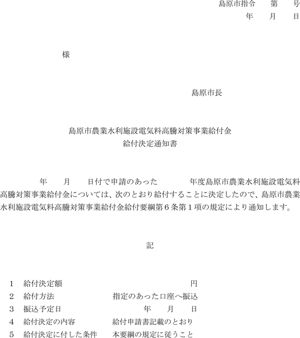 第6条 市長は、前条の規定による申請書を受理したときは、速やかに内容を審査し、給付金を交付することが適当であると認めるときは、給付金の給付の決定を行い、島原市農業水利施設電気料高騰対策事業給付金給付決定通知書(