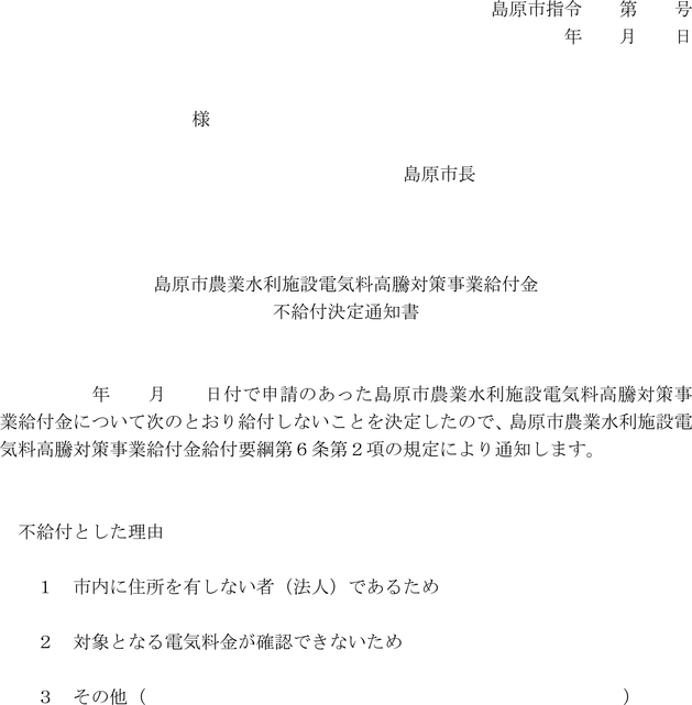2 前項の規定により審査した結果、給付金を給付しないことを決定したときは、理由を付して、島原市農業水利施設電気料高騰対策事業給付金不給付決定通知書(