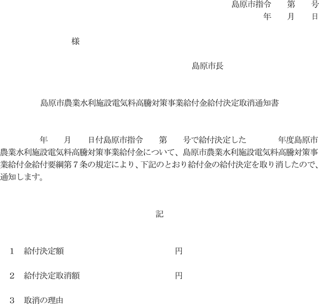 2 市長は、前項の規定により給付金の給付の決定を取り消すときは、島原市農業水利施設電気料高騰対策事業給付金給付決定取消通知書(