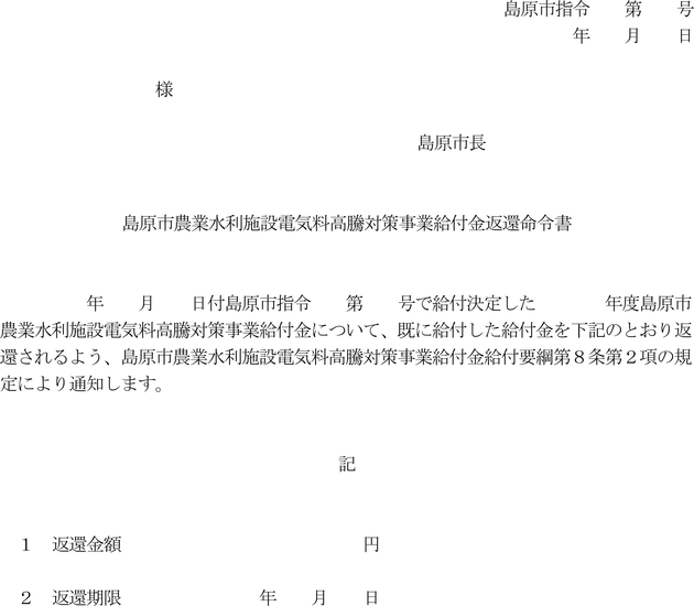 2 市長は、前項の規定により給付金の返還を命ずるときは、島原市農業水利施設電気料高騰対策事業給付金返還命令書(