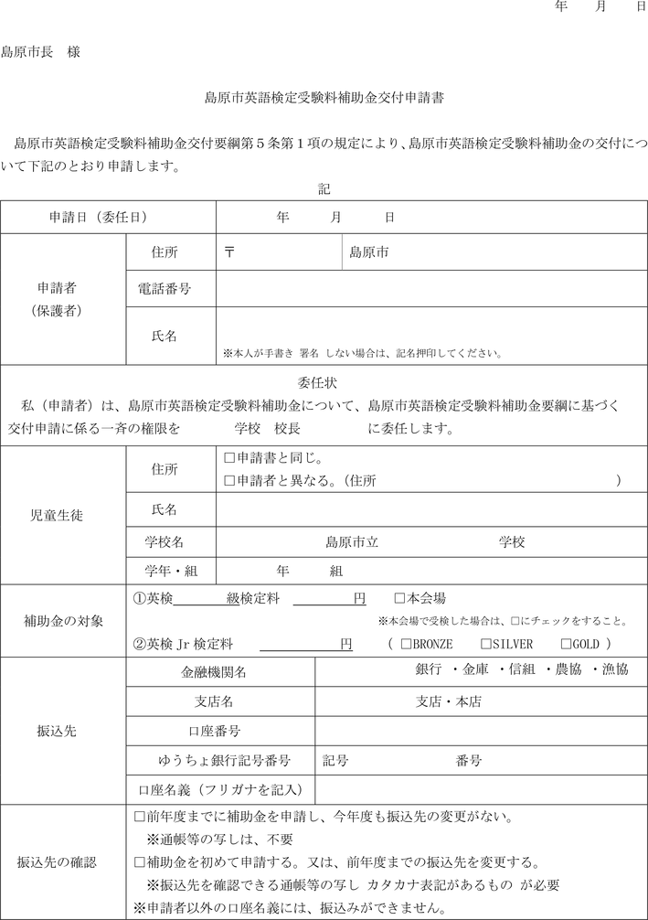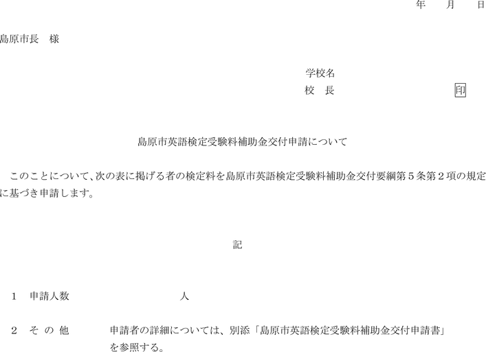 2 前項の規定による申請は、申請者の委任がある場合は、児童生徒が在籍する島原市立小中学校の校長が代理して当該校分を一括して申請することができる。この場合にあっては、前項に規定する申請書に島原市英語検定受験料補助金交付申請について(