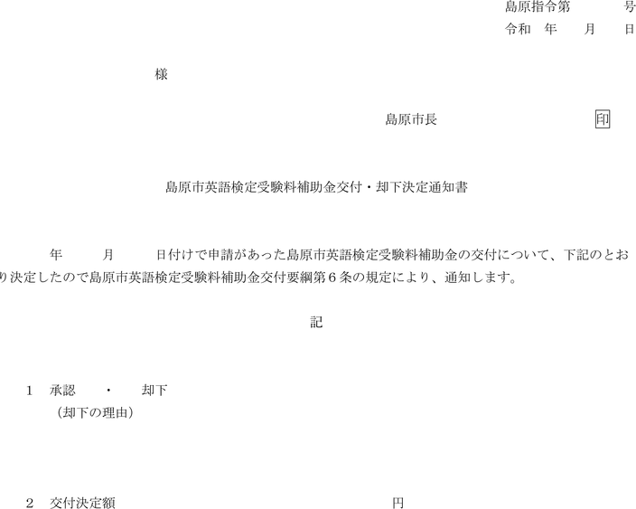 第6条 市長は、前条の規定による申請があったときは、これを審査し、交付の可否を決定し、島原市英語検定受験料補助金交付・却下決定通知書(